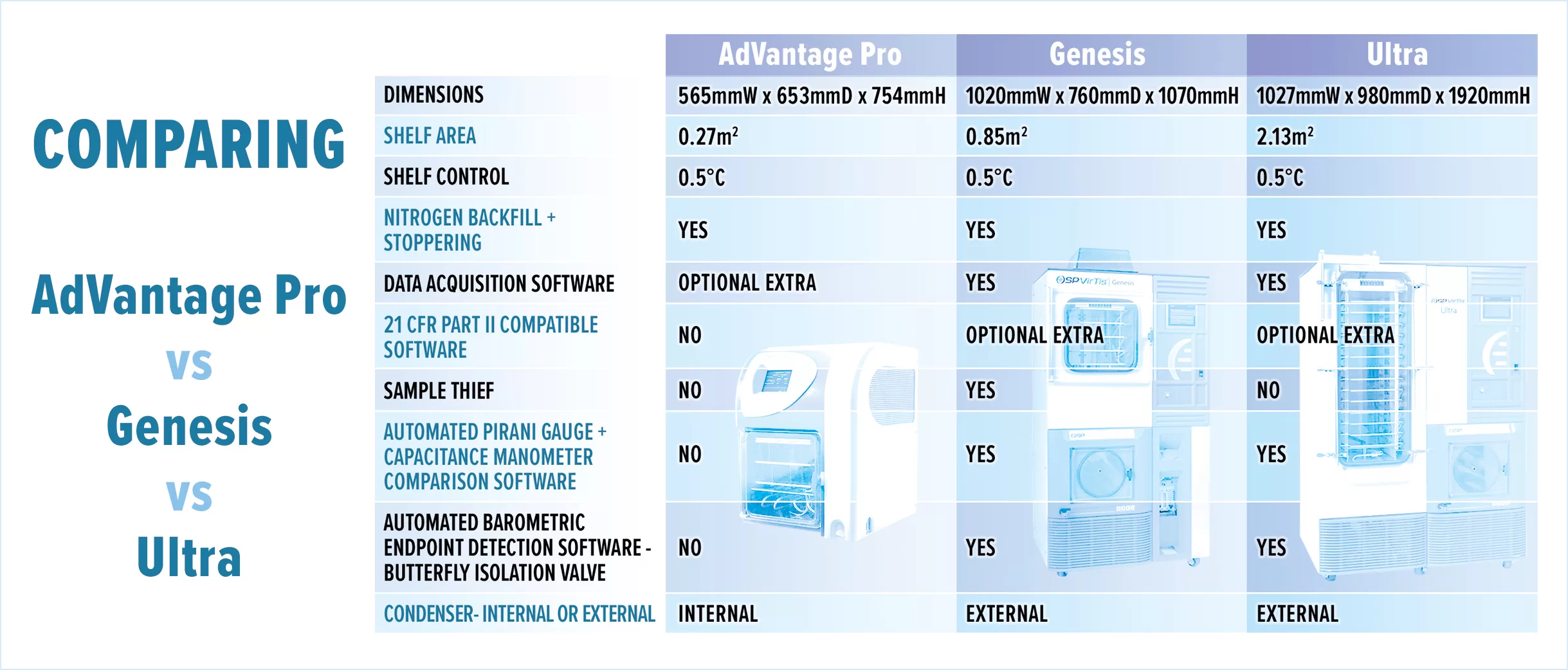The table below describes the differences between the Advantage, Genesis and Ultra freeze dryers.